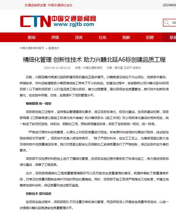 近日,中國交通新聞網(wǎng)以《精細(xì)化管理 創(chuàng)新性技術(shù) 助力興贛北延A6標(biāo)創(chuàng)建品質(zhì)工程》為題,對公司承建的江西興贛北延A6標(biāo)項目建設(shè)進(jìn)行了專題報道。