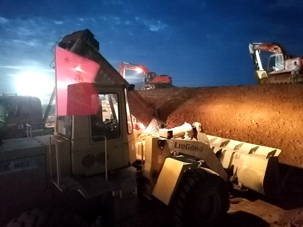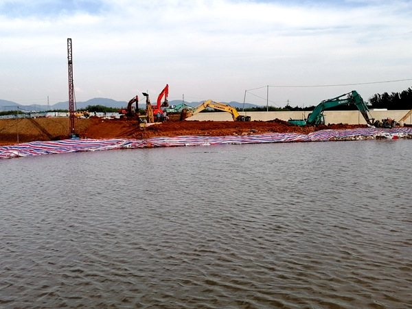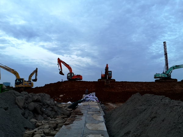 巢湖市東外壞旗山撇洪溝,位于巢湖鼓山腳下,連接清溪河支流,連日降雨,清溪河水位暴漲,防汛壓力巨大,經(jīng)開區(qū)的人民生命和財產(chǎn)安全受到嚴(yán)重威脅。經(jīng)巢湖市政府研究決定,在旗山撇洪溝和清溪河支流交匯處筑壩,將撇洪溝東側(cè)低洼處作為清溪河支流泄洪預(yù)備區(qū),以應(yīng)對清溪河水位暴漲危險。接到汛情指令,巢湖市亞父路項目部迅速出動,組建防汛突擊隊,調(diào)集挖掘機、裝載機等機械設(shè)備迅速奔赴搶險一線,連續(xù)奮戰(zhàn)兩天三夜,填筑黃土近10000方,碎石1500方,拋石700噸,圓滿完成了底寬22米,上寬10米,高5米,長110米的筑壩任務(wù),確保了經(jīng)開區(qū)的人民生命和財產(chǎn)安全。