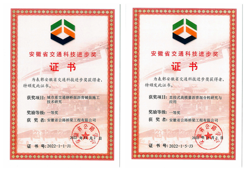 4月20日,安徽省公路學會在涇縣召開八屆一次理事會暨八屆一次常務理事會。會議期間,頒發(fā)了第十屆安徽省公路學會交通科技進步獎,由安徽路橋路面公司參與完成的《城市重交通鋼橋面瀝青鋪裝施工技術研究》《直投式高模量瀝青混合料研究與應用》等兩項研究成果榮獲一等獎。
