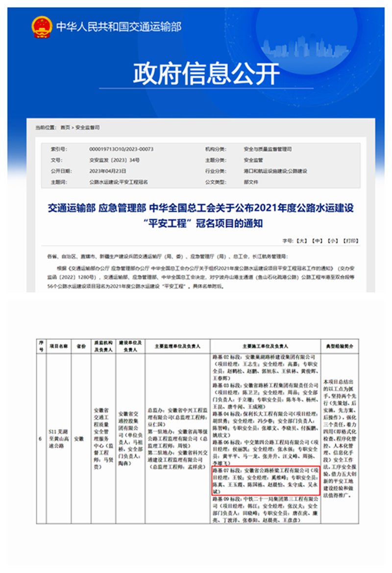 4月23日,交通運(yùn)輸部、應(yīng)急管理部、中華全國(guó)總工會(huì)公布了2021年度公路水運(yùn)建設(shè)“平安工程”冠名項(xiàng)目名單,公司參建的蕪黃高速項(xiàng)目榮獲2021年度全國(guó)公路水運(yùn)建設(shè)“平安工程”冠名,在全國(guó)40個(gè)獲獎(jiǎng)公路項(xiàng)目中排名第6,被作為10個(gè)經(jīng)驗(yàn)典型項(xiàng)目之一全國(guó)推廣,也是安徽省唯一獲得該獎(jiǎng)項(xiàng)的公路工程項(xiàng)目。