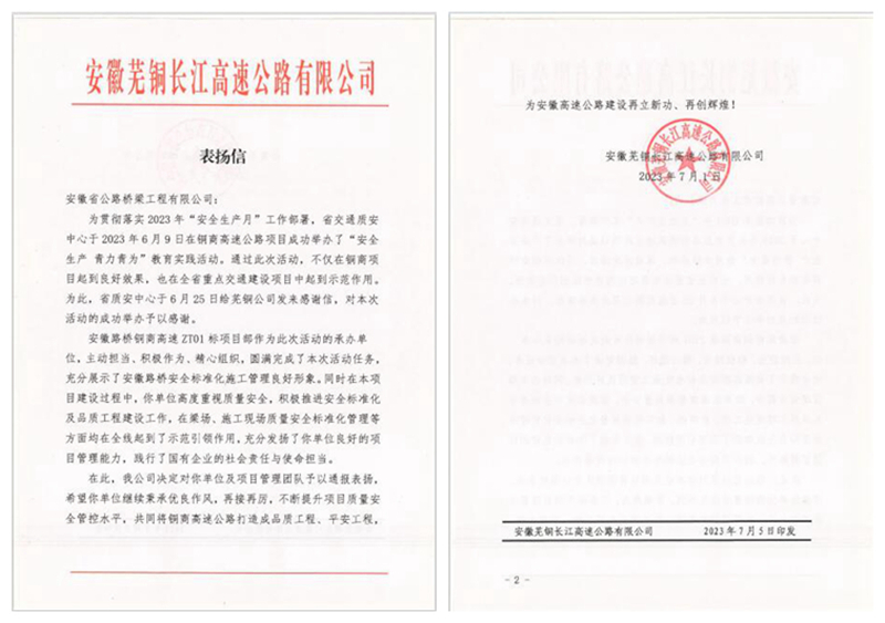 公司獲安徽蕪銅長江高速公路有限公司來信表揚