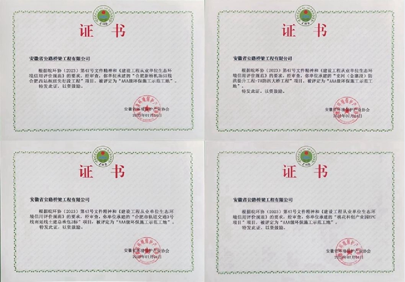 近日,公司承建的桃花科創(chuàng)產業(yè)園EPC項目、史河(金寨段)防洪提升工程-7#防汛大橋項目、合肥新橋機場S1線先行段項目、合肥軌道3號線南延2標項目獲評安徽省環(huán)境保護產業(yè)協(xié)會“AAA級環(huán)保施工示范工地”稱號。