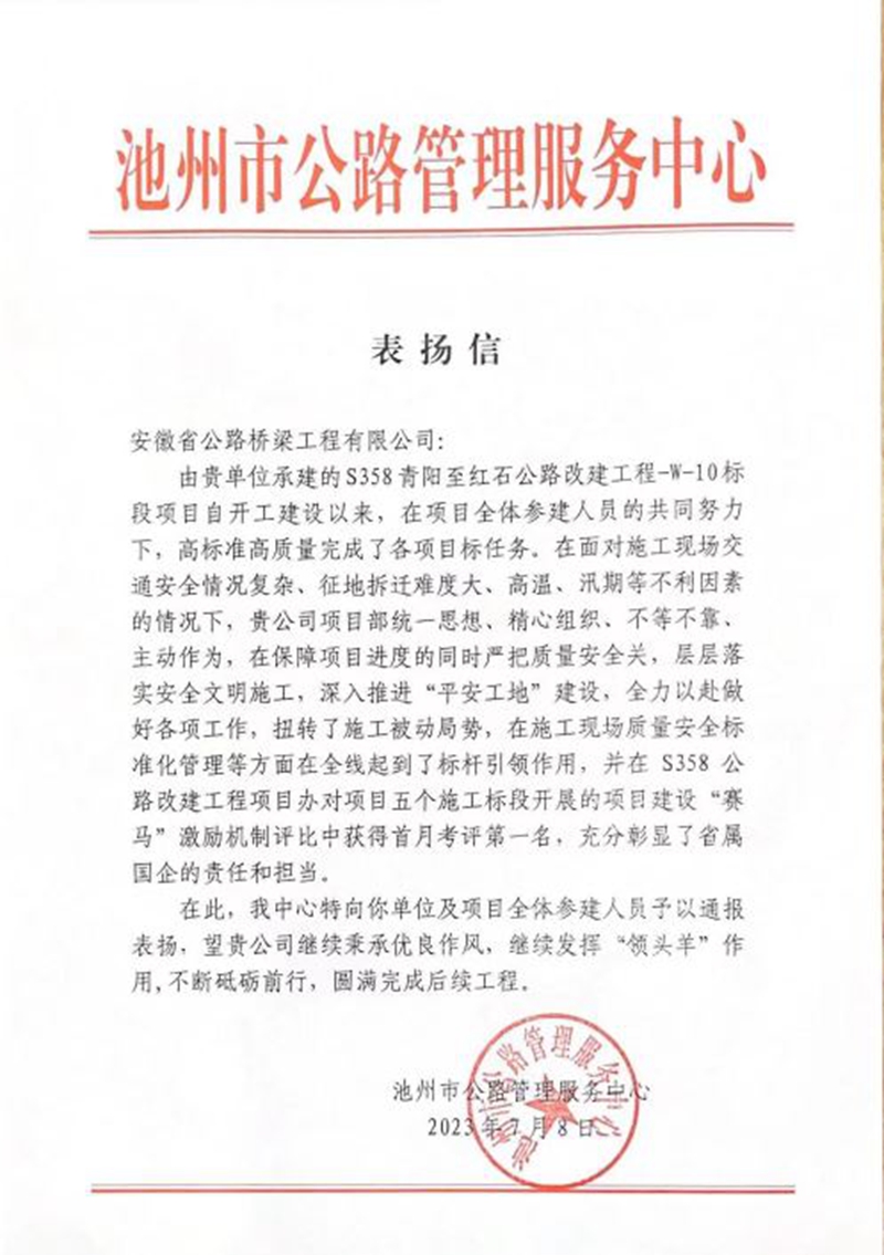 來信指出,公司承建的S358青陽至紅石公路改建工程W10標項目開工建設(shè)以來,面對現(xiàn)場交通安全情況復雜、征遷難度大、高溫、汛期等不利因素,不等不靠、主動作為,在保障進度的同時,推進“平安工地”建設(shè),迅速扭轉(zhuǎn)被動局勢,在質(zhì)量安全標準化管理等方面全線起到標桿引領(lǐng)作用,榮獲S358公路改建工程項目建設(shè)“賽馬”激勵機制首月考評第一名,彰顯了省屬國有企業(yè)的責任與擔當。