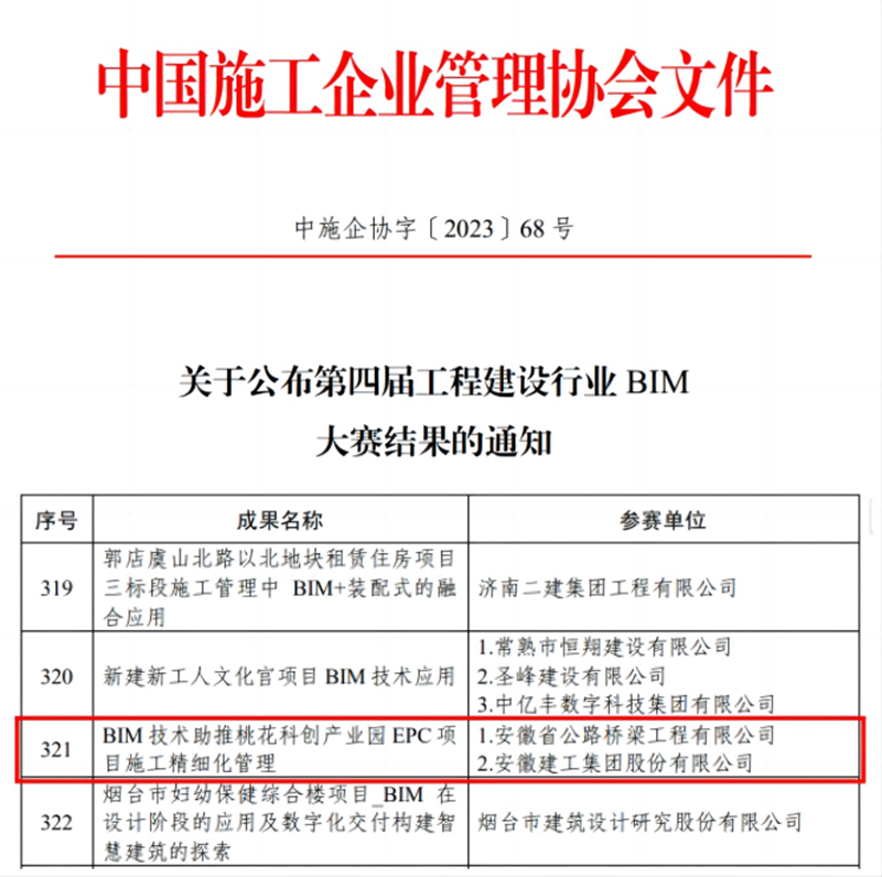 近日,全國第四屆工程建設(shè)行業(yè)BIM大賽結(jié)果揭曉,公司申報的《BIM技術(shù)助推桃花科創(chuàng)產(chǎn)業(yè)園EPC項目施工精細化管理》在3153項參賽成果中脫穎而出,榮獲建筑工程綜合應(yīng)用類三等獎,此次獲獎是公司再次獲得國家級BIM技術(shù)應(yīng)用獎項。
