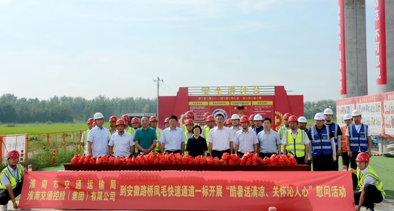 8月11日下午,淮南市交通運輸局黨組成員、副局長潘理想到鳳毛快速通道01標項目開展“送清涼”慰問活動。