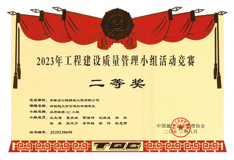 8月11日,中國施工企業(yè)管理協(xié)會(huì)“2023年(首屆)工程建設(shè)行業(yè)質(zhì)量管理小組活動(dòng)高質(zhì)量發(fā)展大會(huì)”在山西太原順利閉幕。會(huì)議對(duì)各地區(qū)及行業(yè)協(xié)會(huì)推薦的1468個(gè)優(yōu)秀QC成果進(jìn)行了集中發(fā)布,其中橋梁分公司申報(bào)的QC成果《提高溫控管接頭安裝一次性驗(yàn)收合格率》榮獲一等獎(jiǎng),市政分公司申報(bào)的QC成果《提高地下車庫地坪施工合格率》《研制超大仿石道板磚鋪裝機(jī)》榮獲二等獎(jiǎng)。