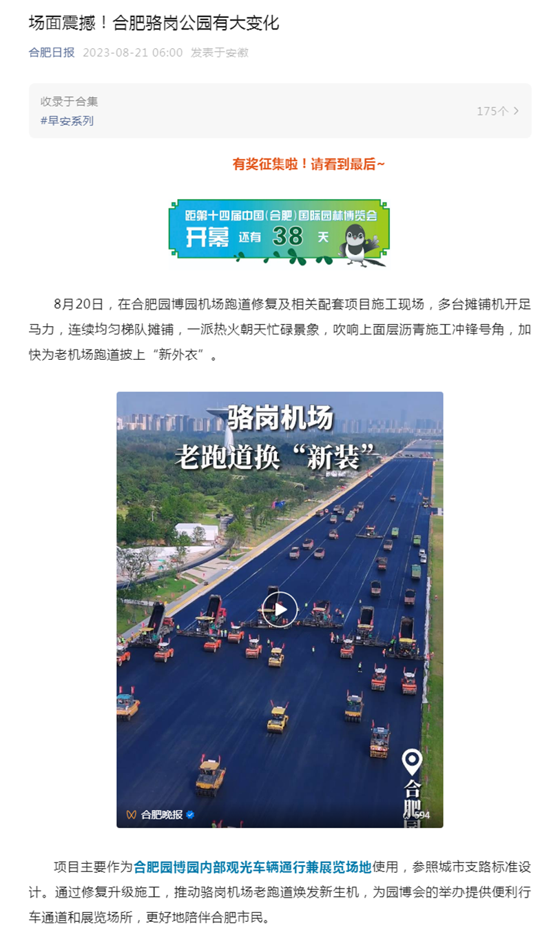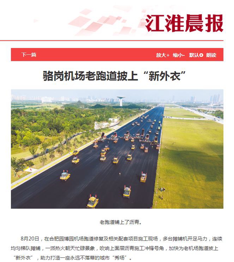 8月20日,公司承建的駱崗中央公園合肥園博園機(jī)場(chǎng)跑道修復(fù)工程項(xiàng)目進(jìn)行瀝青攤鋪施工,中安在線、合肥日?qǐng)?bào)、江淮晨報(bào)和合肥晚報(bào)等多家省市級(jí)媒體聚焦報(bào)道。