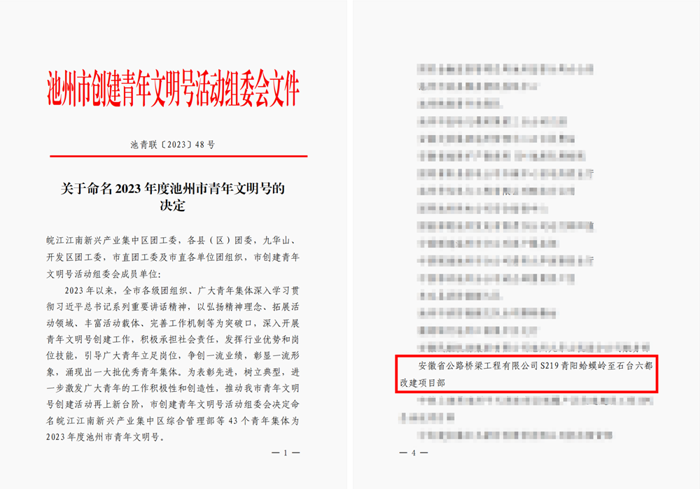 12月7日,池州市青年文明號(hào)風(fēng)采展示暨授牌儀式成功舉辦,現(xiàn)場公布了獲評(píng)2023年度池州市青年文明號(hào)名單,公司承建的S219青陽改建工程項(xiàng)目喜獲殊榮。
