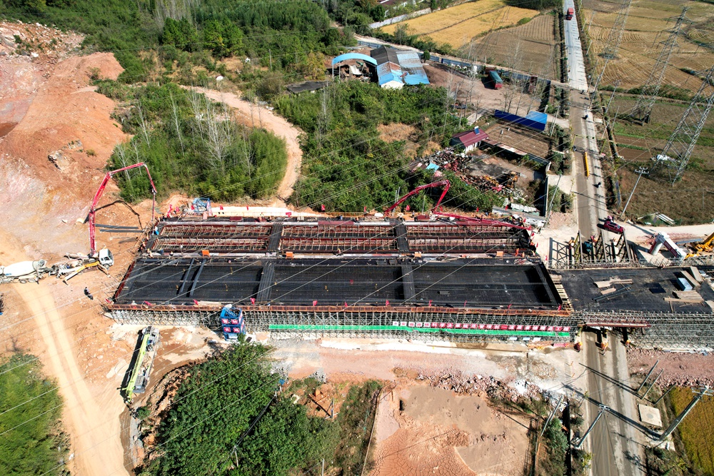 工程建設(shè)制勝在關(guān)鍵點,項目部始終堅持把關(guān)鍵節(jié)點工程攻堅作為“頭號工程”。水東四號橋位于象山腳下,橫跨鄉(xiāng)道施工,施工組織難度大,安全風險高。項目積極組織工作專班,通過優(yōu)化方案、細化分工、倒排工期和現(xiàn)場監(jiān)督等措施,并積極對接當?shù)卣陀嘘P(guān)電力部門,多番實地考察、測量,保障施工過程的有序性、高效性和安全性。2023年11月8日上午,水東四號橋首件現(xiàn)澆梁順利澆筑完成,標志著項目關(guān)鍵施工節(jié)點取得突破性進展。