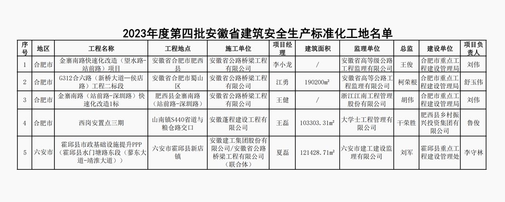 近日,安徽省建設(shè)工程質(zhì)量與安全協(xié)會公布2023年度第四批安徽省建筑安全生產(chǎn)標準化工地名單,由公司承建的金寨南路快速化改造(望水路-站前路)項目、G312合六路(新橋大道-侯店路)工程二標段、金寨南路(站前路-深圳路)快速化改造1標、霍邱縣市政基礎(chǔ)設(shè)施提升PPP(霍邱縣水門塘路東段(蓼東大道-靖淮大道))、肥西文旅西崗安置點三期等5個項目光榮上榜。