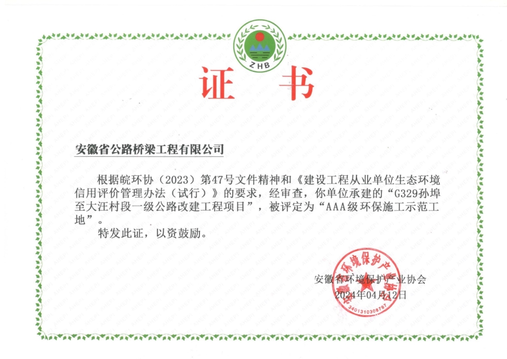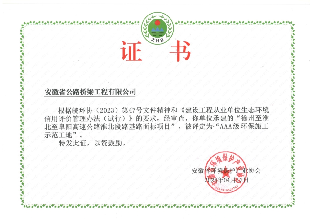 近日,安徽省環(huán)境保護產(chǎn)業(yè)協(xié)會公布了“2024年第2批建設(shè)工程從業(yè)單位生態(tài)環(huán)境信用評價結(jié)果”,由公司承建的徐州至淮北至阜陽高速公路淮北段路基路面標、G329孫埠至大汪村段一級公路改建工程和合肥新橋國際機場綜合交通中心(含軌道引入)及配套工程施工總承包項目獲評安徽省“AAA級環(huán)保施工示范工地”稱號。