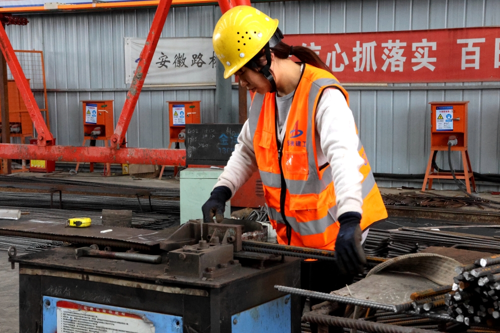 在G329改建工程項目預制梁場的鋼筋加工棚內,工人正在對預制梁所需要的鋼筋進行彎曲。目前,該項目橋梁已進入橋面系施工階段,路基施工正式進入瀝青攤鋪階段。