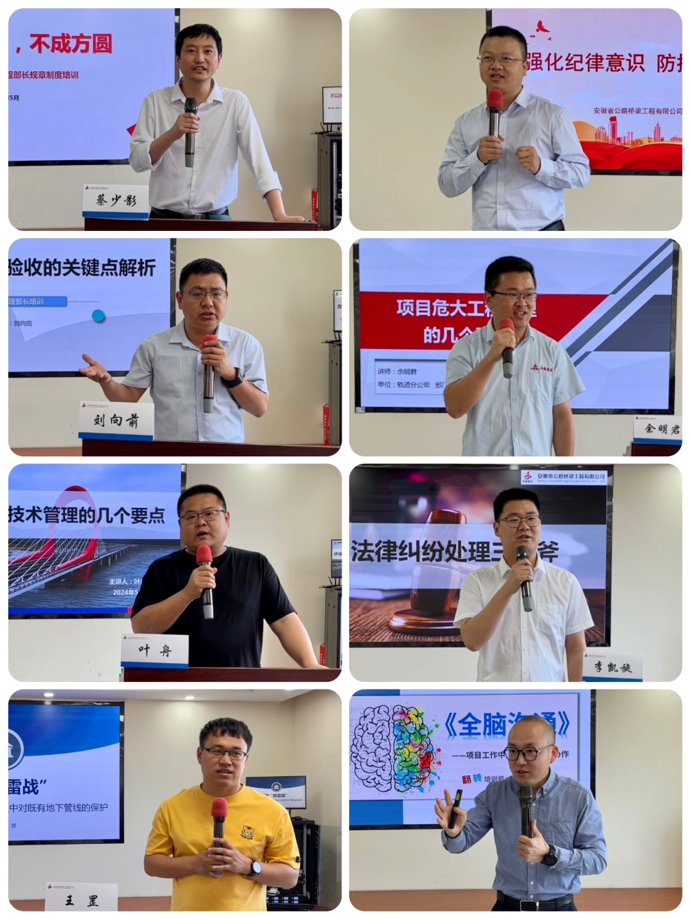 培訓采用新老講師結(jié)合的形式,內(nèi)容涉及公司最新規(guī)章制度解析、方案編制和檢查驗收、橋梁工程施工技術(shù)、地下管線保護、項目危大工程、廉潔教育、法律糾紛處理以及通用管理課程等。