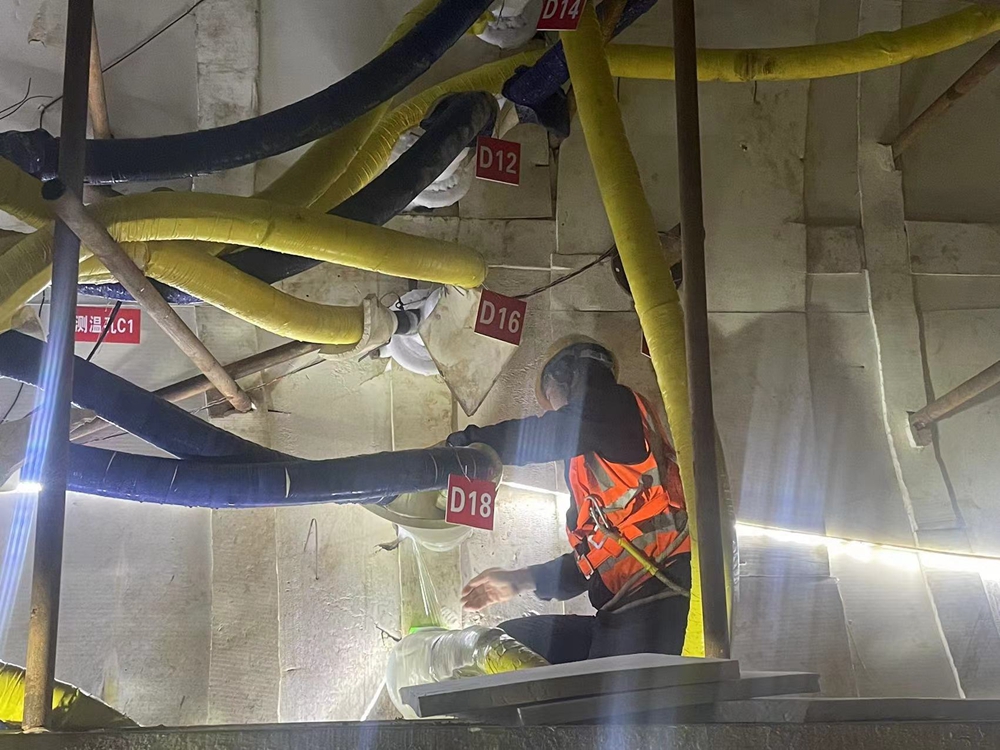 “形象地說,冷凍系統(tǒng)就好似一個不停機(jī)的冰箱,冷凍鹽水始終在-30℃左右把土體冷凍成堅硬的‘冰棍’,增加其強(qiáng)度和穩(wěn)定性。同時這種人工制冷技術(shù)適應(yīng)面廣、安全可靠、污染性小,而且完全不用抽排地下水,一定程度上也減少了地下水資源的浪費(fèi)”,項(xiàng)目負(fù)責(zé)人宋廣輝介紹。