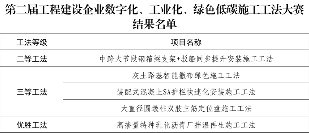 近日,中國施工企業(yè)管理協(xié)會公布了第二屆工程建設(shè)企業(yè)數(shù)字化、工業(yè)化、綠色低碳施工工法大賽結(jié)果,公司《中跨大節(jié)段鋼箱梁支架+駁船同步提升安裝施工工法》《灰土路基智能撒布綠色施工工法》等五項工法在眾多參賽工法中脫穎而出,分別獲得二等工法1項、三等工法3項、優(yōu)勝工法1項。