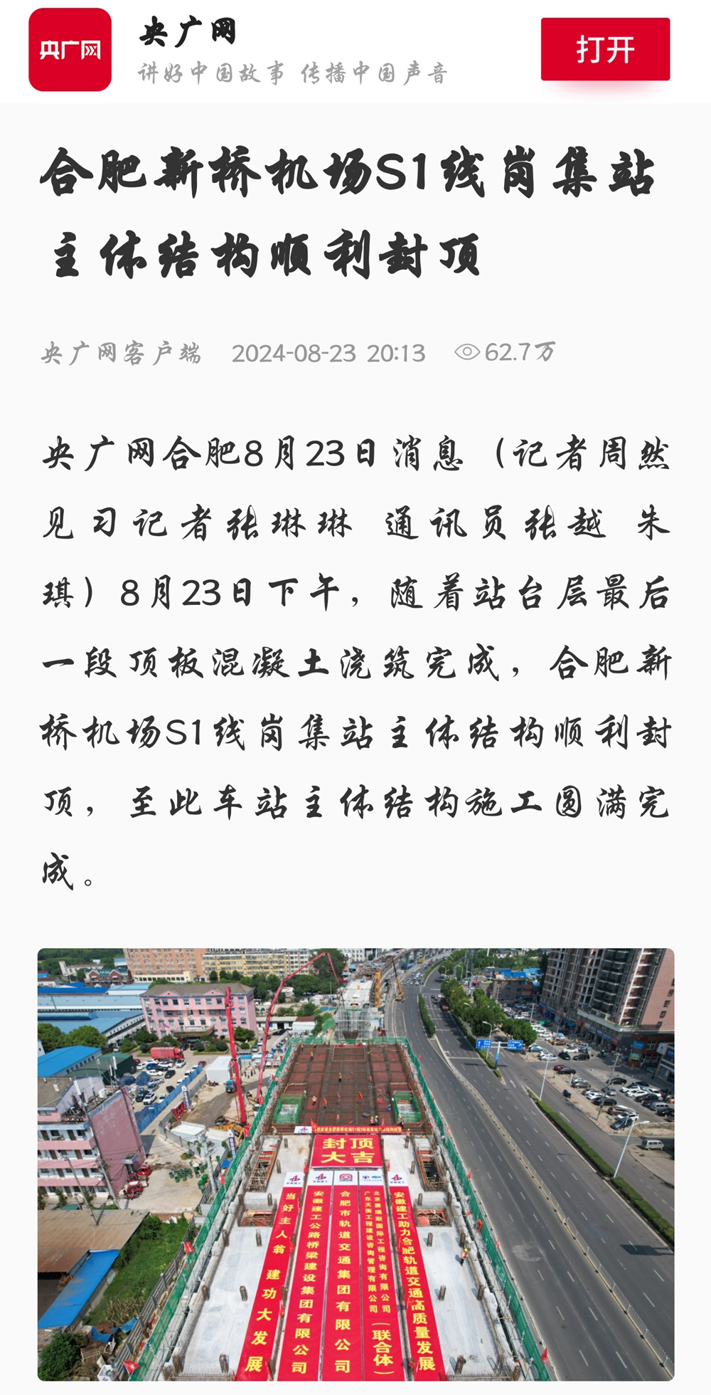 【名媒聚焦】央廣網(wǎng)、中安在線、安徽日報等主流媒體聚焦合肥新橋機場S1線項目崗集站主體結(jié)構(gòu)封頂