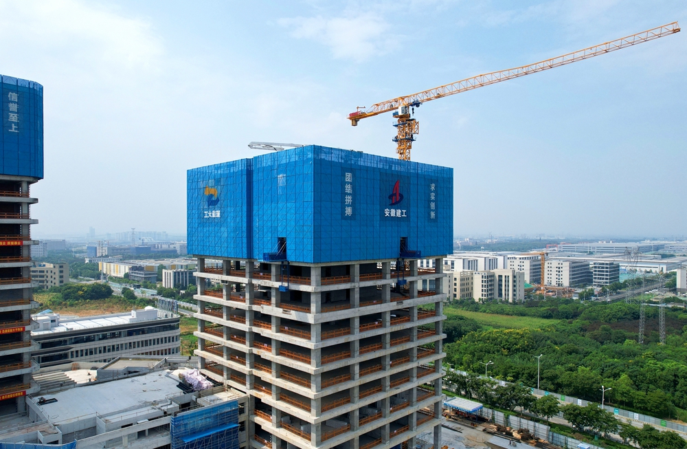 桃花科創(chuàng)產業(yè)園項目A1#樓,是公司承建的首個超高層建筑,地上29層、地下2層,總建筑面積5.4萬平方米,建設高度129.6米,建成后將成為包含辦公、商業(yè)、酒店的商業(yè)綜合體。建設過程中,項目采用智能布料機及附著式升降腳手架等新工藝新技術,實現(xiàn)6天一個標準層的建設新速度,步入“快增長”時期。