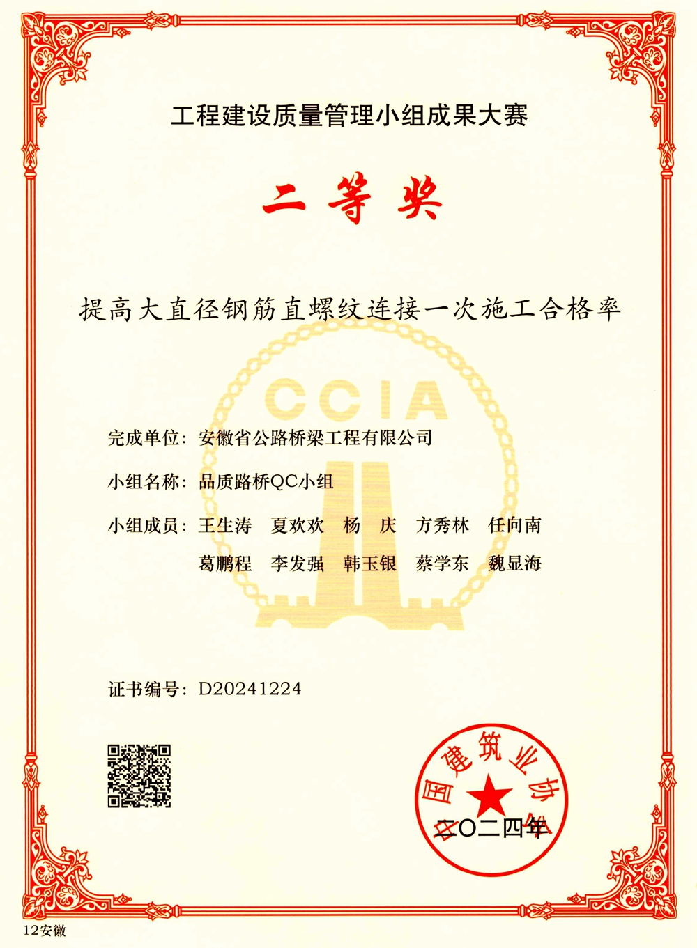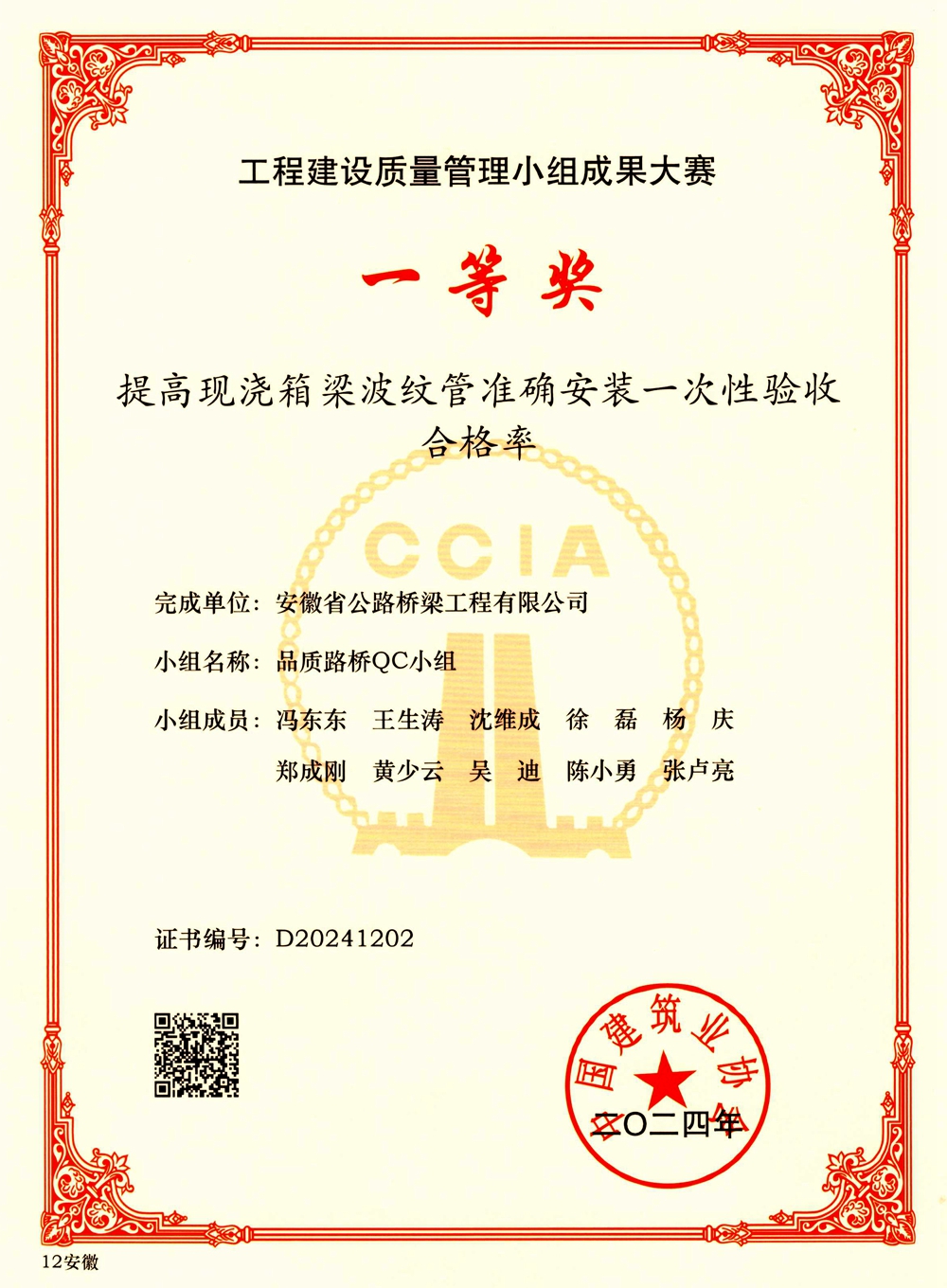 近日,中國建筑業(yè)協(xié)會公布了2024年工程建設(shè)質(zhì)量管理小組成果大賽名單,公司申報3項QC成果榜上有名。
