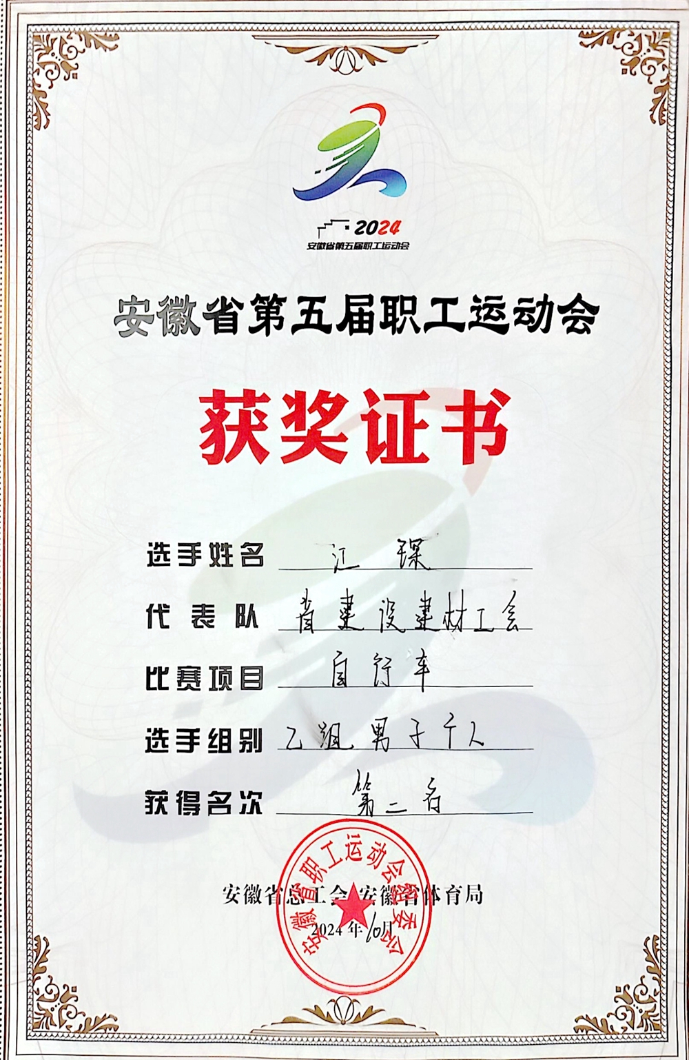 10月13日,由安徽省總工會、安徽省體育局聯(lián)合舉辦的省第五屆職工運動會自行車比賽在池州舉行,公司選送的參賽選手江琛代表省建設(shè)建材工會參加角逐,經(jīng)過激烈比拼,取得乙組自行車男子個人第二名的優(yōu)異成績。