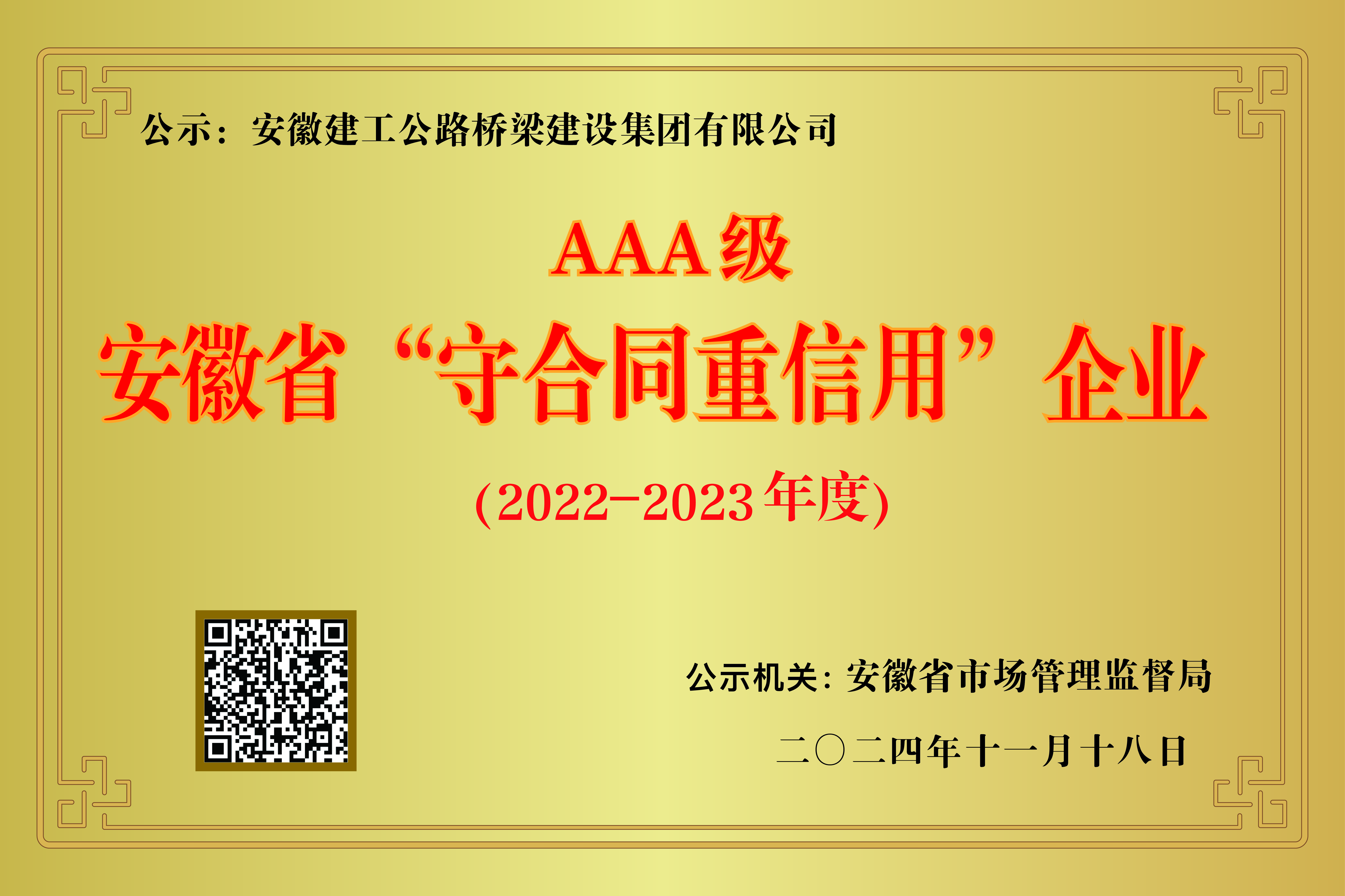 近日,安徽省市場監(jiān)督管理局發(fā)布了2022-2023年度“安徽省守合同重信用”AAA級企業(yè)名單,公司榮登榜單。
