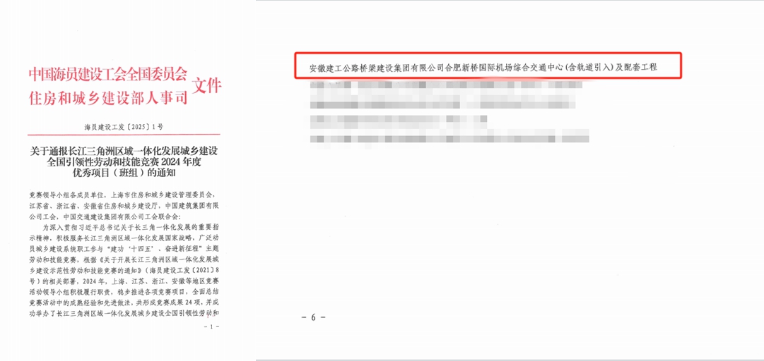 近日,中國海員建設(shè)工會、住房和城鄉(xiāng)建設(shè)部人事司對長江三角洲區(qū)域一體化發(fā)展城鄉(xiāng)建設(shè)全國引領(lǐng)性勞動和技能競賽2024年度優(yōu)秀項目(班組)進行表彰。公司承建的合肥新橋國際機場綜合交通中心項目榜上有名。