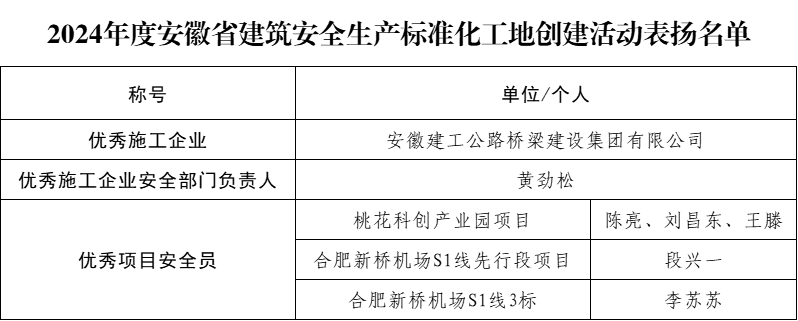 近日,安徽省建設(shè)工程與質(zhì)量安全協(xié)會(huì)發(fā)布表?yè)P(yáng)通知,公司榮獲“2024年度安徽省建筑安全生產(chǎn)標(biāo)準(zhǔn)化工地優(yōu)秀施工企業(yè)”稱(chēng)號(hào),公司安全環(huán)保部黃勁松同志榮獲“2024年度安徽省建筑安全生產(chǎn)標(biāo)準(zhǔn)化工地優(yōu)秀施工企業(yè)安全部門(mén)負(fù)責(zé)人”稱(chēng)號(hào),桃花科創(chuàng)產(chǎn)業(yè)園項(xiàng)目、合肥新橋機(jī)場(chǎng)S1線先行段項(xiàng)目、S1線3標(biāo)等3個(gè)項(xiàng)目安全管理人員榮獲“優(yōu)秀項(xiàng)目安全員”稱(chēng)號(hào)。