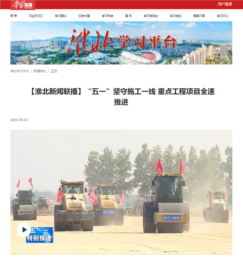 “五一”期間,公司承建的合肥新橋國際機場綜合交通中心項目、淮桐高速合肥段路基2標、S235濉唐路三期項目、徐淮阜高速淮北段項目、S20長固高速路基01標等一批項目“火力全開”,奮戰(zhàn)二季度,在江淮大地奏響項目建設(shè)“協(xié)奏曲”,受到央廣網(wǎng)、學(xué)習(xí)強國、安徽新聞聯(lián)播、大皖新聞等多家主流媒體的關(guān)注報道。