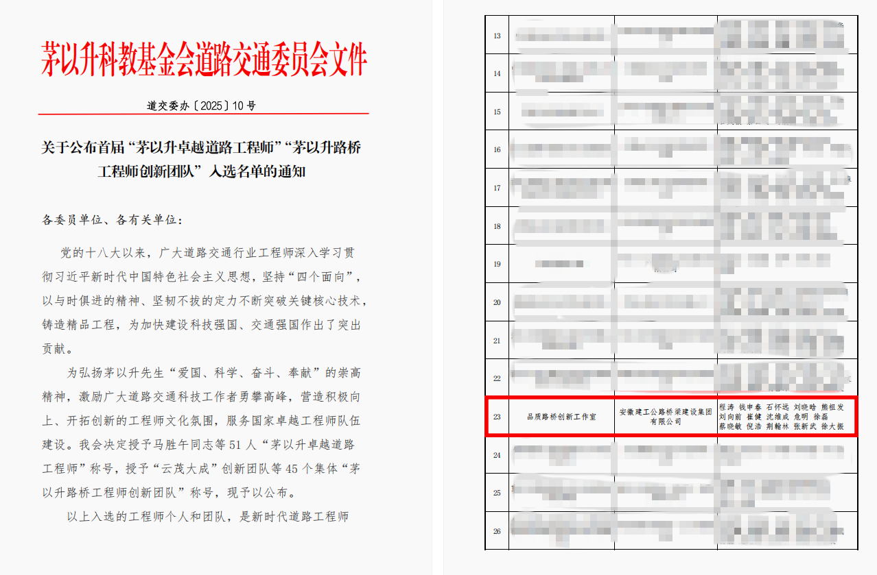 近日,茅以升科技教育基金會道路交通委員會公布首屆“茅以升路橋工程師創(chuàng)新團隊”評選結果,公司“品質路橋創(chuàng)新工作室”憑借扎實的技術攻關能力與突出的工程實踐成果成功入選。