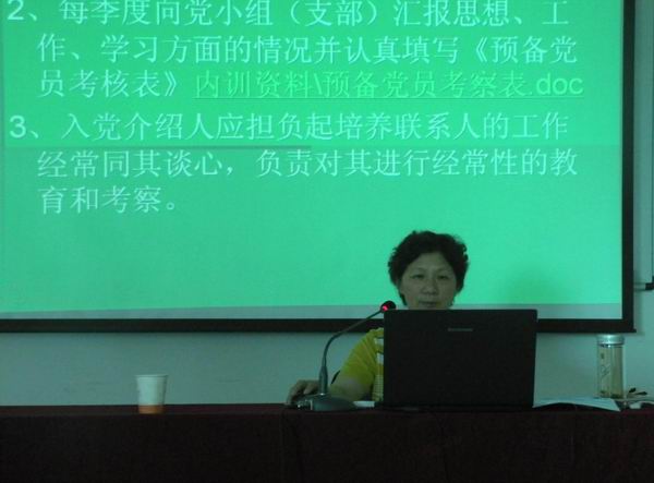 黨委辦公室主任劉昀主持了培訓(xùn)會,并就發(fā)展黨員工作程序,作了專題講座。劉主任通過PPT課件,系統(tǒng)的介紹了黨員發(fā)展程序,從制訂發(fā)展黨員的工作計劃開始,到預(yù)備黨員轉(zhuǎn)正、整個入黨材料存入個人檔案,以及最后的責(zé)任追究都作了詳細(xì)介紹,讓與會人員對發(fā)展黨員工作的程序有了清楚的了解。隨后,大家一起觀看了《欲之害——段義和腐敗案件警示錄》。專題片揭露了段義和利用職務(wù)便利大肆索賄的腐敗行徑,深刻揭示了腐化墮落的思想根源和蛻變軌跡。通過觀看警示教育片,使大家接受了一次深刻的思想教育和精神洗禮,進(jìn)一步認(rèn)識了在新形式下反腐倡廉建設(shè)的重要性。