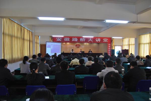 公司領(lǐng)導(dǎo)、項目部及分支機構(gòu)領(lǐng)導(dǎo)、機關(guān)全體員工等一百多人參加了揭牌儀式和講座,揭牌儀式及講座由公司黨委書記陳光磊主持。公司總經(jīng)理汪衛(wèi)東在揭牌儀式上發(fā)表了重要講話。汪總首先對戴總在百忙中抽空為安徽路橋大講堂啟動授課表示衷心的感謝,隨后汪總從實現(xiàn)公司十二五發(fā)展戰(zhàn)略規(guī)劃及加強公司人力資源開發(fā)和培訓(xùn)工作兩方面闡述了安徽路橋大講堂開辦的重要意義。汪總強調(diào)指出通過大講堂這一平臺的建設(shè),將進一步提升公司管理人員的管理能力和技巧,更新管理理念和思路;加強各類專業(yè)技術(shù)人員的交流與學(xué)習(xí),推廣新技術(shù)、新經(jīng)驗;并通過宣貫公司戰(zhàn)略規(guī)劃和企業(yè)文化理念,進一步統(tǒng)一員工的思想,促進共同價值觀的形成。汪總還對安徽路橋大講堂的組織者和所有參與者提出了具體的要求。