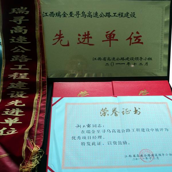 公司承建的瑞尋A7標(biāo)在公司的正確領(lǐng)導(dǎo)下,在以劉大雷同志為首的項(xiàng)目全體員工的共同奮斗下,經(jīng)過兩年的頑強(qiáng)拼搏、艱苦施工,終于實(shí)現(xiàn)了瑞尋高速公路的建成通車,在贛南大地描繪了一條絢麗的彩虹,書寫了一幅質(zhì)優(yōu)、安全、廉潔、環(huán)保的壯麗畫卷。瑞尋A7標(biāo)以工程質(zhì)量更優(yōu)、外觀形象更美、生態(tài)環(huán)境更佳、依法管理更嚴(yán)、安全廉潔更好為要求,以抓細(xì)節(jié)、樹精品、講程序、促規(guī)范、善創(chuàng)新、爭一流為管理理念,取得了一系列的優(yōu)異成績。在項(xiàng)目辦的兩次階段評(píng)比中均獲得A段第一,全線第二名的好成績,還獲得了業(yè)主頒布的“先進(jìn)單位”稱號(hào),項(xiàng)目經(jīng)理劉大雷獲得了瑞尋項(xiàng)目“優(yōu)秀項(xiàng)目經(jīng)理”稱號(hào),項(xiàng)目總工戴聲慶、副經(jīng)理鳳爾飛、王星輝和黃明明四人獲得了“先進(jìn)個(gè)人”稱號(hào)。