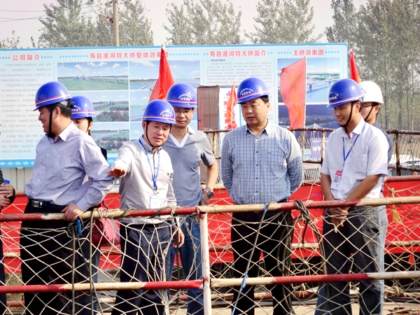 10月15日,安徽交通投資集團(tuán)董事長(zhǎng)喬傳福蒞臨濟(jì)祁高速01標(biāo)淮河特大橋主墩鋼圍堰水下混凝土封底施工現(xiàn)場(chǎng)檢查指導(dǎo)工作。濟(jì)祁高速淮合段建設(shè)辦主任張其云陪同。