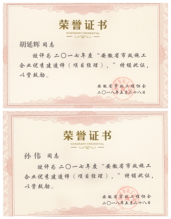 近日,從安徽省市政工程協(xié)會傳來喜訊,公司榮獲2017年度安徽省“優(yōu)秀市政施工企業(yè)”榮譽稱號,錢申春、胡延輝、孫偉三位同志榮獲2017年度安徽省“市政施工企業(yè)優(yōu)秀建造師”榮譽稱號。