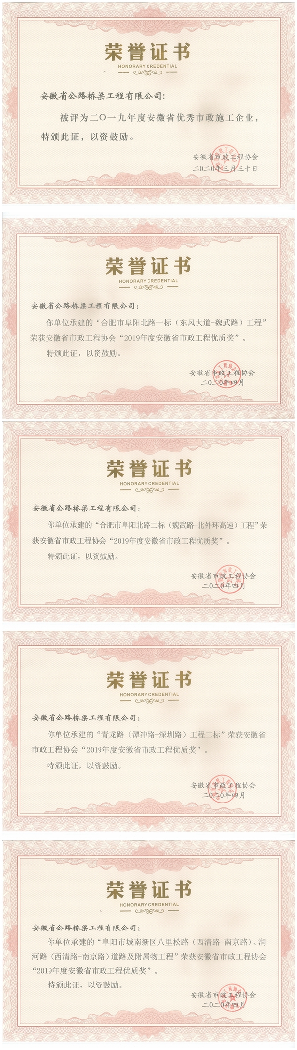 近日,安徽省市政工程協(xié)會(huì)發(fā)布2019年度安徽省優(yōu)質(zhì)工程獎(jiǎng)評(píng)選結(jié)果和2019年度安徽省優(yōu)秀市政施工企業(yè)。阜陽北路高架北延一標(biāo)、二標(biāo),阜陽八里松路項(xiàng)目、青龍路工程二標(biāo)等項(xiàng)目被授予“2019年度安徽省市政工程優(yōu)質(zhì)獎(jiǎng)”,公司再次榮獲“2019年度安徽省優(yōu)秀市政施工企業(yè)”稱號(hào)。