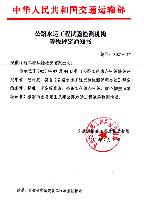 環(huán)通工程試驗檢測有限公司順利獲批交通部公路工程綜合甲級試驗檢測資質(zhì)