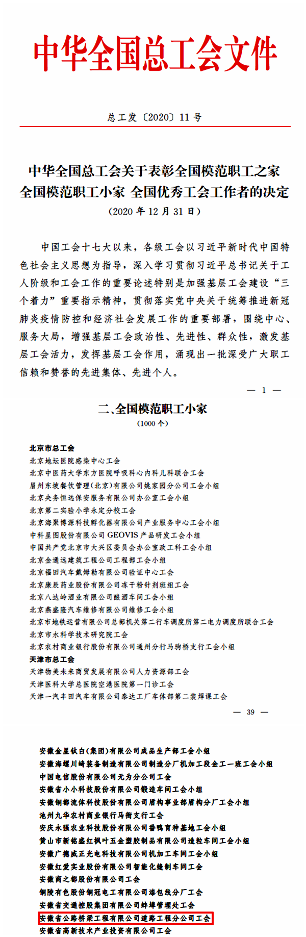 近日,中華全國(guó)總工會(huì)印發(fā)《中華全國(guó)總工會(huì)關(guān)于表彰全國(guó)模范職工之家全國(guó)模范職工小家全國(guó)優(yōu)秀工會(huì)工作者的決定》,道路分公司入選“全國(guó)模范職工小家”榮譽(yù)稱號(hào),為公司工會(huì)工作注入新的成色。