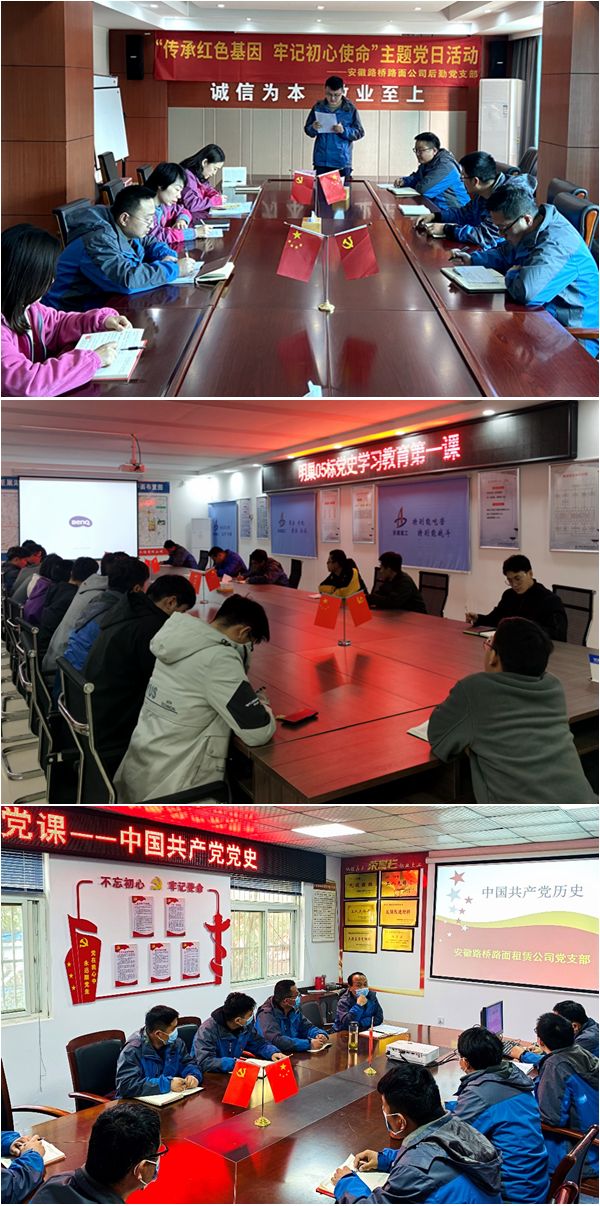 路面后勤黨支部開展“傳承紅色基因 牢記初心使命”主題黨日活動,黨員代表分享了《朱德的扁擔(dān)》《一床打補(bǔ)丁的棉被》等紅色經(jīng)典故事。明巢項目黨支部組織學(xué)習(xí)《中國共產(chǎn)黨簡史》第一章,與會黨員以“紅船精神”為主題,結(jié)合自身工作分享如何繼承弘揚革命精神,守好初心、擔(dān)好使命。路面租賃公司黨支部開展黨史故事學(xué)習(xí)交流會,學(xué)習(xí)革命先烈在實現(xiàn)民族獨立、國家解放中所做出的突出貢獻(xiàn)和不怕犧牲、敢于流血的革命精神,并分享交流學(xué)習(xí)心得。