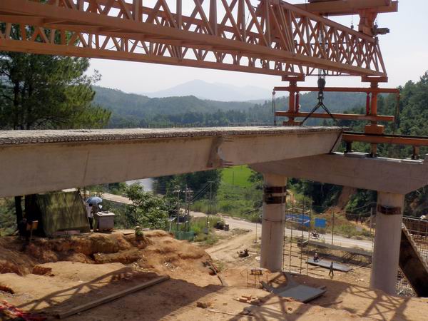 為了確保架梁工作的順利開展,項目部領(lǐng)導(dǎo)到現(xiàn)場指導(dǎo)架橋機(jī)的拼裝、檢驗等工作,通過對架梁人員進(jìn)行分部分項技術(shù)交底,讓所有現(xiàn)場作業(yè)人員都能做到熟捻于心。經(jīng)過施工人員精心施工,努力奮斗,于10月2日完成架橋機(jī)拼裝,10月3日完成調(diào)試。10月5日,在項目部領(lǐng)導(dǎo)、監(jiān)理和駐地辦領(lǐng)導(dǎo)的共同指揮下,我標(biāo)段首片箱梁成功架設(shè)。現(xiàn)場鞭炮齊鳴,掌聲如雷,為國慶增添新的喜慶。