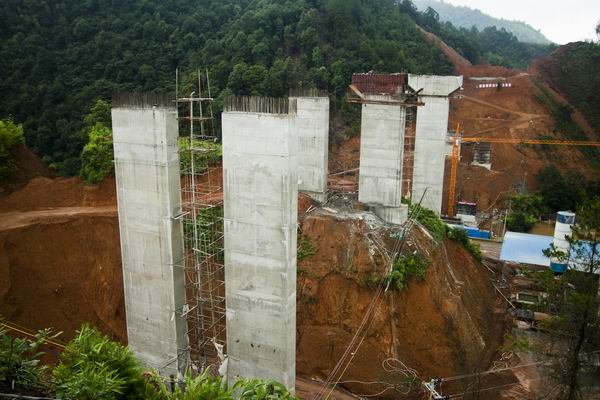 蘆灣一橋的3、4號(hào)墩,是空心薄壁墩,而且還是水中樁;蘆灣二橋的4、6號(hào)墩,地處縣崖峭壁、地形復(fù)雜,再加上空心薄壁墩每天平均只有施工